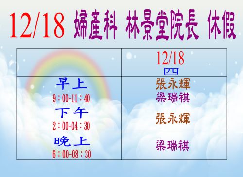12/18(四) 婦產科 林景堂院長 休假如圖示:
