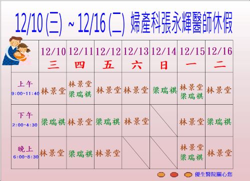 12/10 ~ 12/16 婦產科門診異動