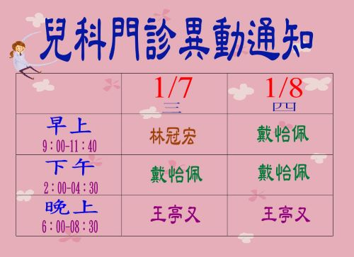 1/7(三) 1/8(四) 小兒科門診醫師看診異動如圖示: