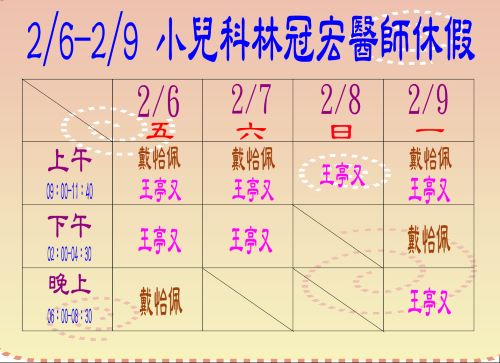 2/6(五)~2/9(一) 林冠宏醫師修下如下圖所示: